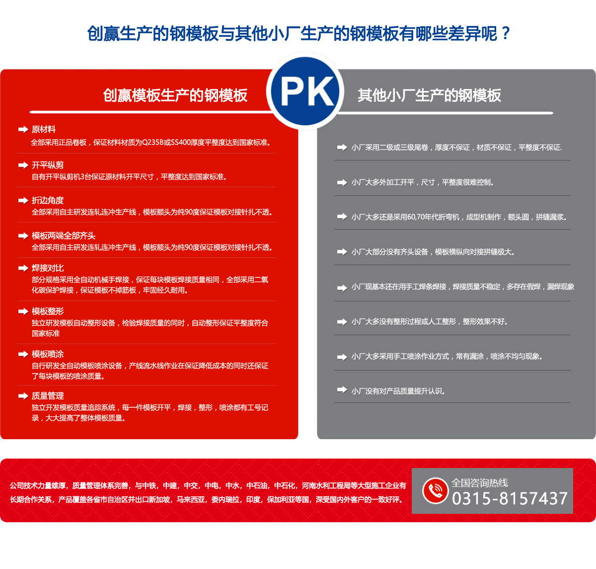 唐山創(chuàng)贏模板有限公司(原唐山豐南雙贏金屬結(jié)構(gòu)廠)始建于一九九七年,是具規(guī)模實(shí)力的組合模板生產(chǎn)企業(yè)。公司技術(shù)力量雄厚,質(zhì)量管理體系完善,與中鐵,中建,中交,中電,中水,中石油,中石化,河南水利工程局等大型施工企業(yè)有長期合作關(guān)系,產(chǎn)品覆蓋各省市自治區(qū)并出口新加坡,馬來西亞,委內(nèi)瑞拉,印度,保加利亞等國,深受國內(nèi)外客戶的一致好評。
